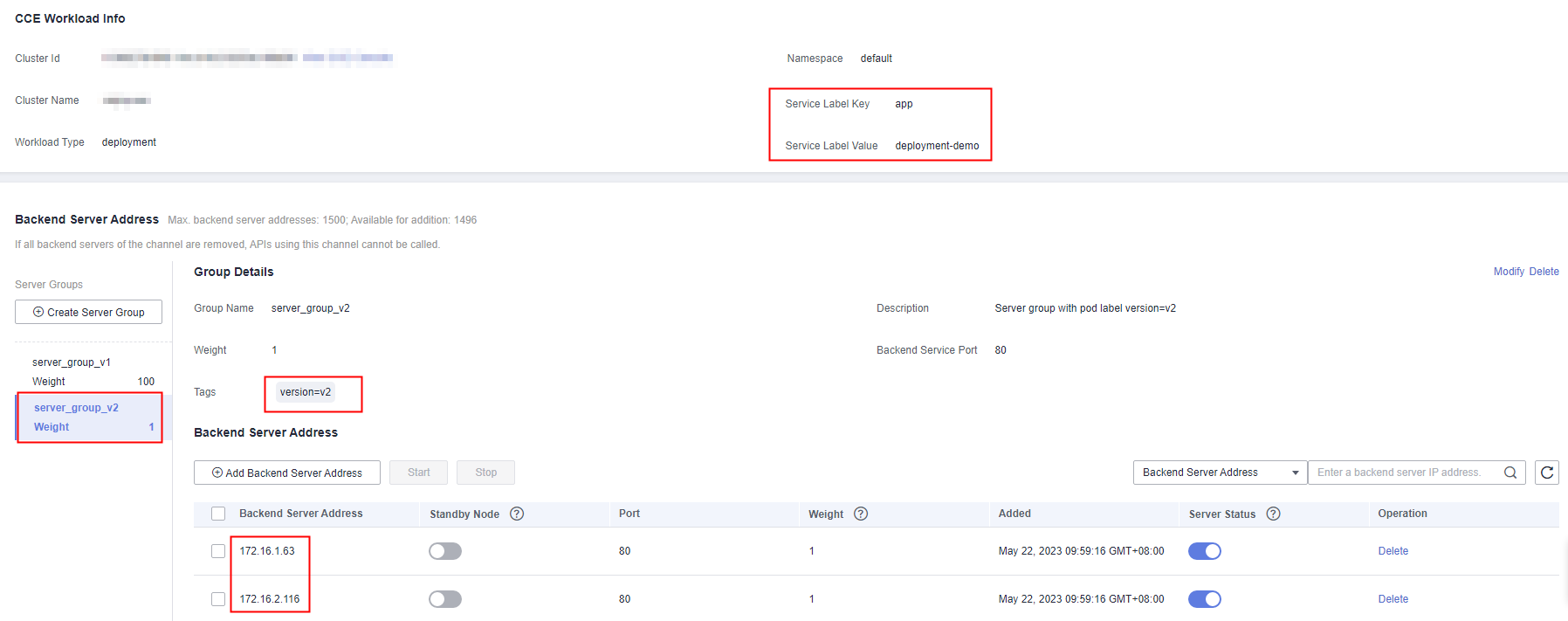 Refresh the page for the backend server addresses. The load balance channel automatically monitors the pod IP addresses of the workload and dynamically adds the addresses as backend server addresses. As shown in the following figure, tags