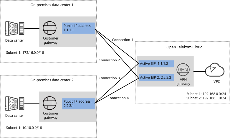 Parameter Description Value Name Name of a VPN gateway. vpngw-001 Network Type Select Public network. Public network Associate With Select VPC. If the VPN gateway is associated with an enterprise router, select Enterprise Router. VPC VPC Open Telekom Cloud VPC that the on-premises data centers need to access. vpc-001(192.168.0.0/16) Local Subnet VPC subnets that the on-premises data centers need to access. 192.168.0.0/24,192.168.1.0/24 Interconnection Subnet This subnet is used for communication between the VPN gateway and VPC. Ensure that the selected interconnection subnet has four or more assignable IP addresses. 192.168.2.0/24 BGP ASN BGP AS number. 64512 HA Mode Select Active-active. Active-active Active EIP EIP 1 used by the VPN gateway to access the on-premises data center. 1.1.1.2 Active EIP 2 EIP 2 used by the VPN gateway to access the on-premises data center. 2.2.2.2