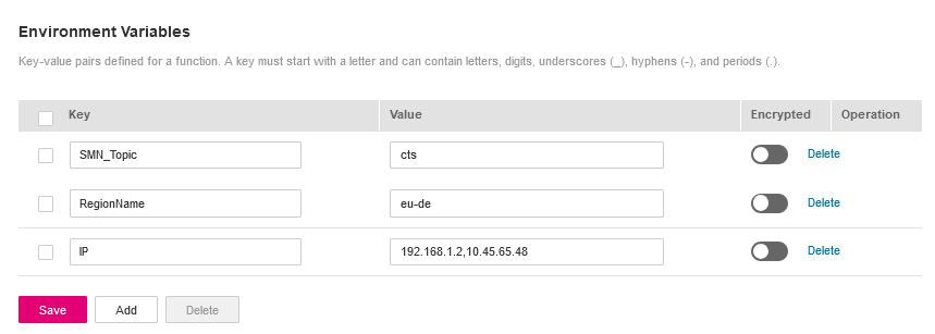 On the Configuration tab page of the function, set the environment variables and SMN topic name, as shown in table below: