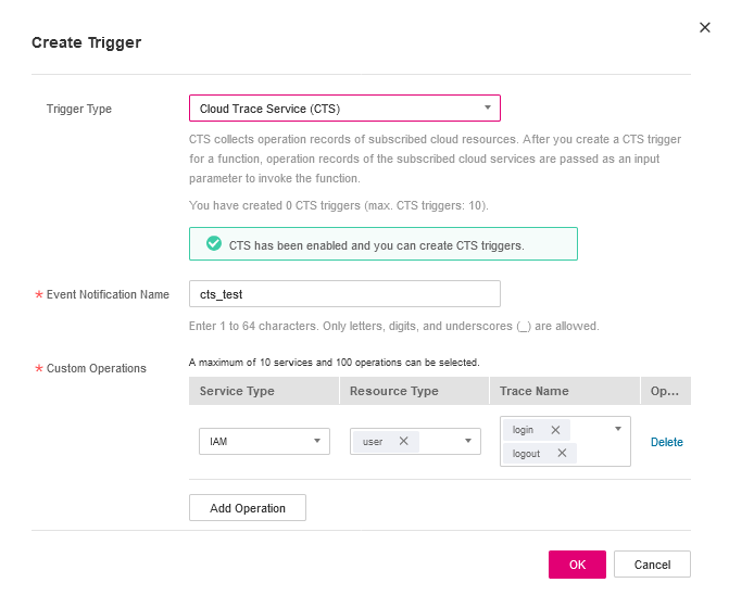 Create a CTS trigger, as shown in Enabling CTS. For details, see Using a CTS Trigger.
