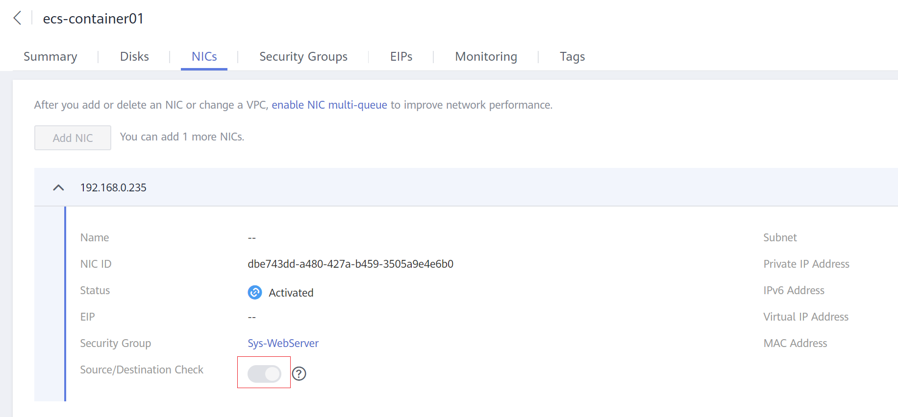 After the ECS is created, disable source/destination check on the ECS NIC, as shown in the figure below: