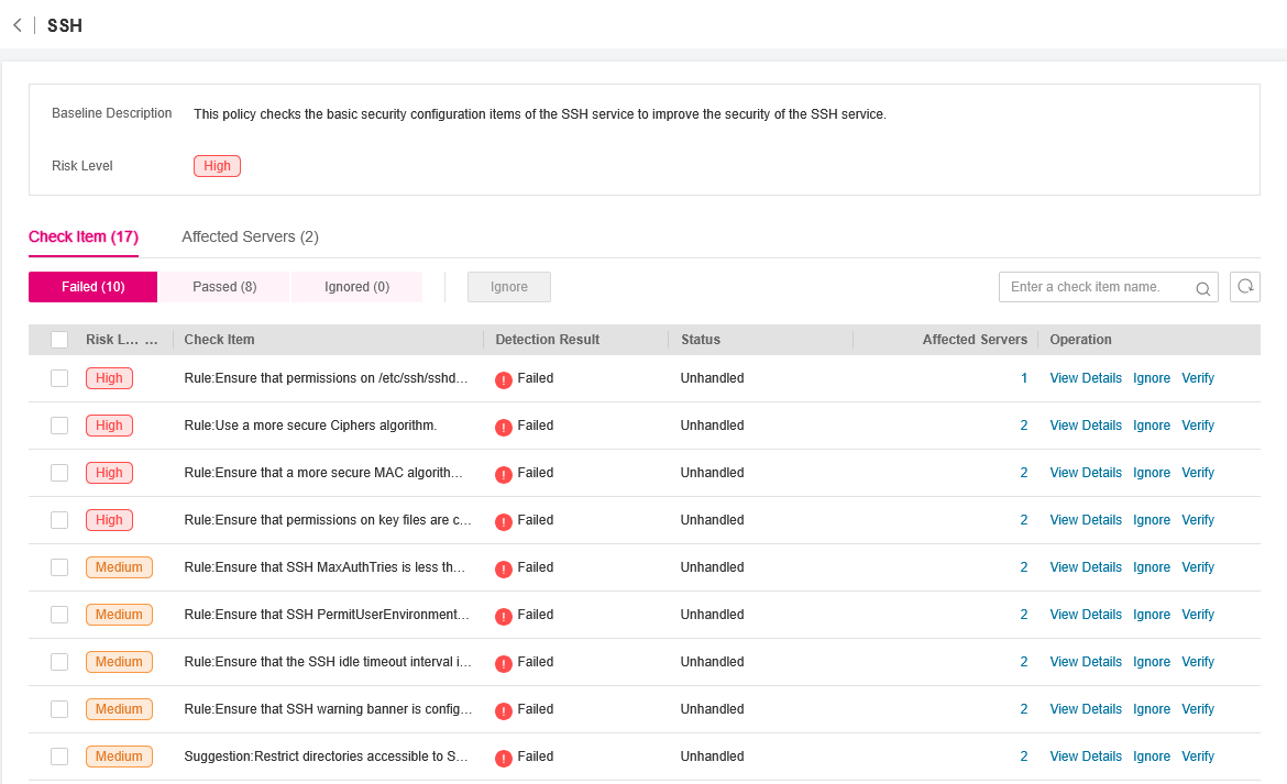 Click View Details in the Operation column of a check item to view the modification suggestions and affected servers.